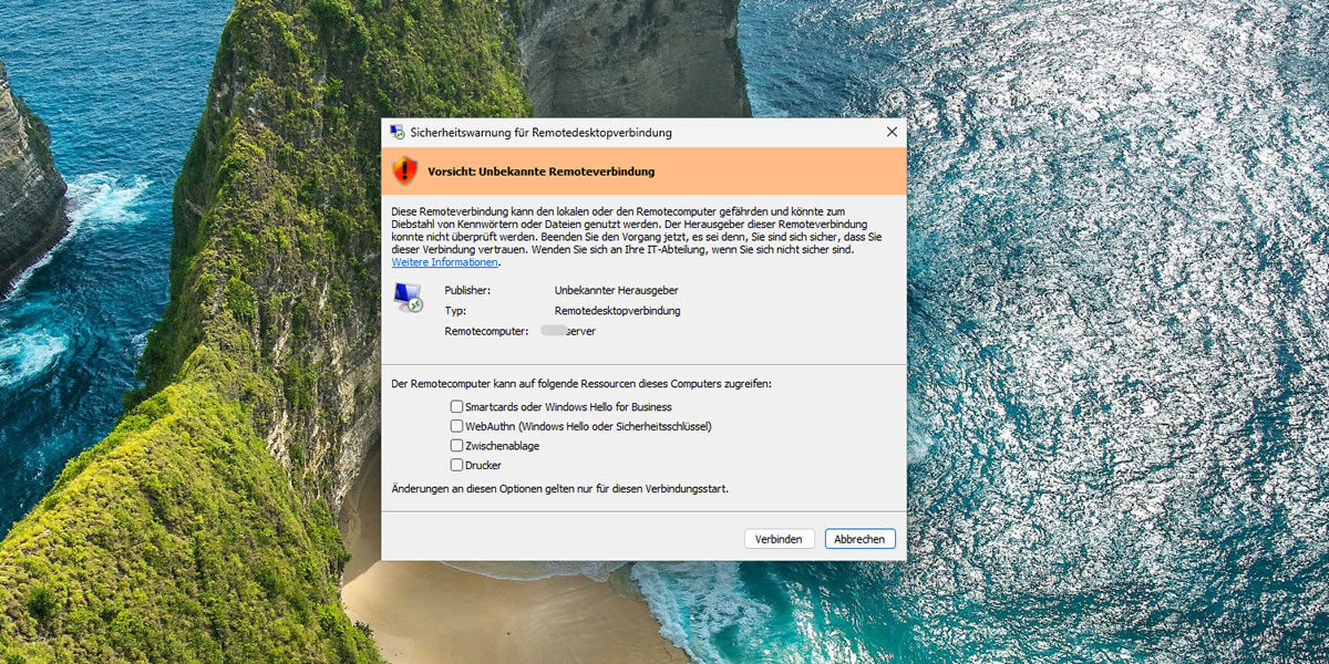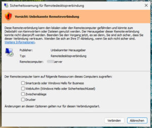 Um beim Aufbau einer Verbindung bessere Informationen bereitzustellen, wird nun ein neuer Sicherheitsdialog angezeigt. Dieser erscheint vor dem Herstellen der Verbindung und zeigt die Adresse des Remotecomputers, Informationen zum Herausgeber (sofern verfügbar) sowie die angeforderten Zugriffsrechte auf lokale Ressourcen an. Alle Einstellungen sind standardmäßig deaktiviert und müssen ausdrücklich freigegeben werden. Beim erstmaligen Öffnen einer RDP-Datei erscheint zusätzlich eine einmalige Sicherheitswarnung.